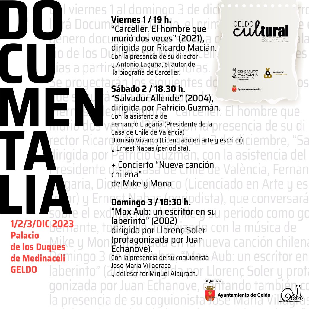 Este próximo viernes, 1 de diciembre, el pequeño municipio del Alto Palancia, que ostenta la capitalidad cultural valenciana 2023, acoge su primera edición de «Documentalia Geldo» con la proyección de tres documentales biográficos y posteriores mesas redondas sobre los largometrajes emitidos La pequeña localidad de Geldo, en el corazón de la comarca del Alto Palancia […]