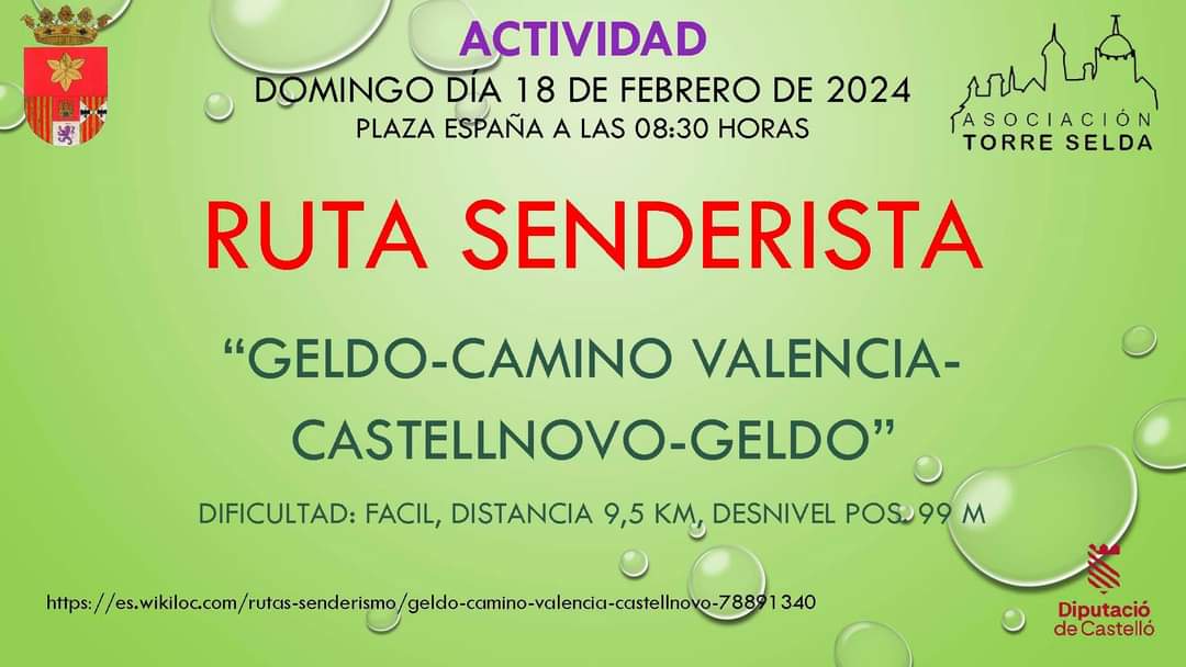 El domingo 18 de febrero, con salida a las 8.30 h desde la Plaza de España, la Asociación Cultural Torre Selda organiza una ruta senderista de 9,5 km y de escasa dificultad (99 m de desnivel positivo) desde Geldo a Castellnovo por el Camino València y vuelta.