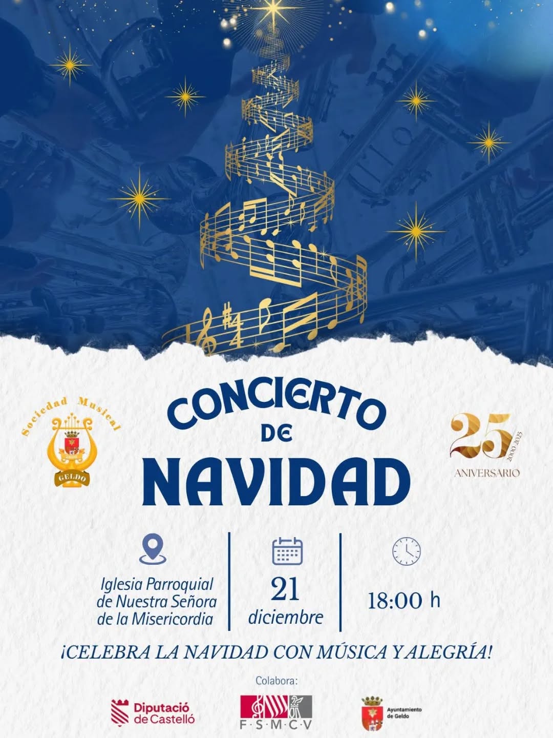 El próximo domingo 21 de diciembre a partir de las 18.00 h en la Iglesia Parroquial de Nuestra Señora de la Misericordia de Geldo, la Sociedad Musical Geldo celebra su tradicional Concierto de Navidad.